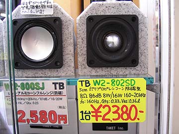 右はTBの5cmフルレンジユニット。発売からすでに2年ほど経過しているので、いまさら珍しいものではないが、これが出た時にはびっくりしたものだ。5cmながらけっこうイケるサウンドで、特にW2-800SJは分解能が高く、好ましい再生音を有している。ニアフィールドで効果を発揮しそう。ま、自分ではまだ使った事無いけどね。 |