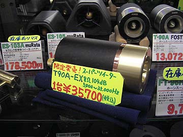 似たような木質硬化剤には色々あるが、例えば木肌マモールというものが挙げられる。これはずいぶんと安い。オーディオ用ではなく、木の食器などに用いられる腐食防止材だが、木質を硬化させるという作用は同じ。オーディオ用に効果があるのか、いつか検証してみたいとは思っている。木肌マモールは新木場のもくもくに売っている。東急ハンズでは見かけた事が無い。 フォステクスのスーパーツイーターT90A-EX中古、もしくは展示処分。私が来店した時点では値札が付いていなかった。気になる人は電話で確認してみるべし。これも、今年初頭に予約完売した限定ツイーターで、入手は困難。 |