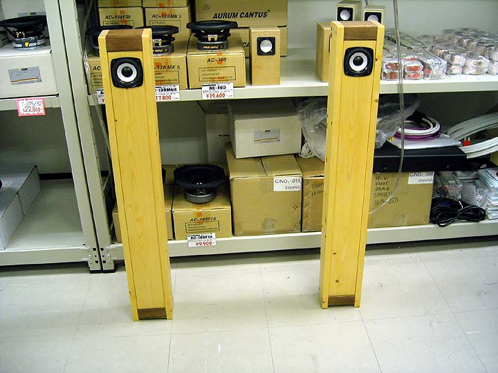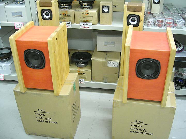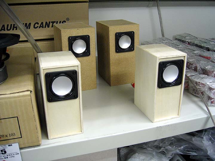 | これはTBの5cmフルレンジユニットを用いた小型スピーカー。5.5mm厚のシナ合板を使用している。手のひらサイズで、ニアフィールドリスニングに最適と思われる。これ、ユニットが1個2580円なので、板材とターミナル合わせても、ペアで1万くらいで製作出来そう。んでもって、これがなかなかフレッシュな音を聴かせてくれるんです。後ろにあるのは、ユニットが同じで、箱をMDF合板にしたもの。大きさも前列のシナ合板タイプより若干大きい。けど、どちらも手のひらサイズ。このユニット、型番はW2-800SJと言う。同店やキムラ無線やコイズミ無線でも売っている。TBの5cmユニットは、同型番をはじめとして、4種類が輸入されているが、私がかつてキムラ無線で試聴した限りでは、このW2-800SJが一番、解像度と質感が高かった。振動板は強化アルミコーンの逆ドーム型。高域の延びが心地よいので、これをツイーターとして応用している人も、どこかで見かけた事がある。 | ||||||||||||||||||||||||||||||||||||||||||||||||||||||||||||||||