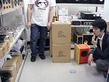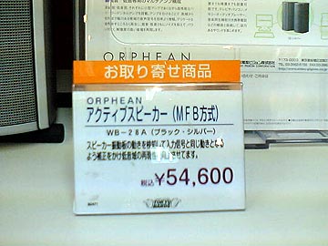 ORPHEANのスピーカーWB-28A。東急ハンズ渋谷店が取扱の第一店舗目だったと思う。このメーカー、このアクティブスピーカー(アンプ内蔵スピ ーカー)をもってオーディオ業界に初進出してきた。今年のAVフェスタにも初参加していた。写真の角度が悪いので、よく分りにくいが、アルミ筐体の頑丈なスピーカーボックスで、造りは頑丈。音もけっこう良いが、オーディオマニアじゃない人にとっては、この価格はやや高額なのでは。江川三郎先生あたりがこのスピーカーを取り上げれば、オーディオマニアへの認知度も上がるだろう。