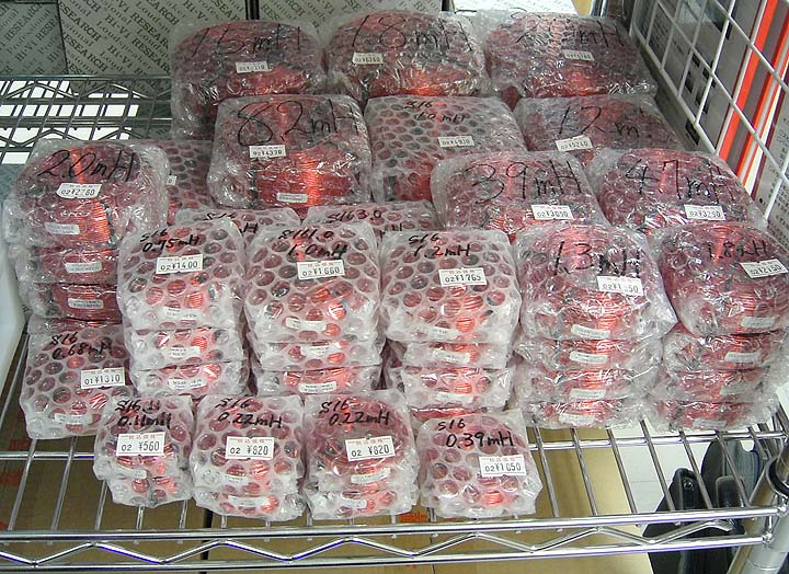 | ついでに、同店で売られている他のコイル。左上はJANTZENの銅箔コイル。値段は普通。この銅箔コイル、正確な金額は記憶していないが、サウンドアティックスの輸入しているDIYAUDIOの銅箔コイルと値段的に拮抗する。ま、値段は同店のサイトに載っているかもしれん。