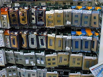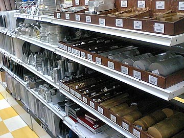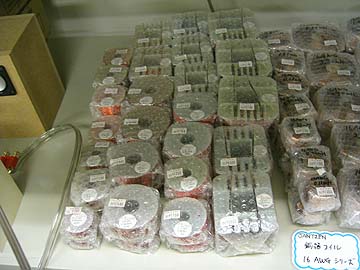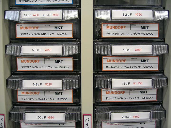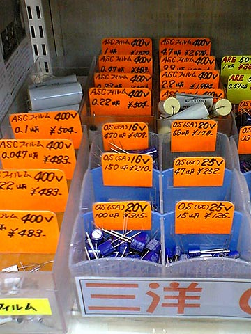 | 若松通商秋葉原駅前店。ラジオ会館の4階にある。ASCのフィルムコンデンサの陳列風景。自作スピーカーマニアに人気の高音質コンデンサだ。手前にはサンヨーのOSコンデンサが陳列されている。サンヨーのOSコンは自作アンプ製作マニアに人気。既製品のオーディオ機器の改造(基盤上のコンデンサの交換による高音質化)にもよく用いられている。