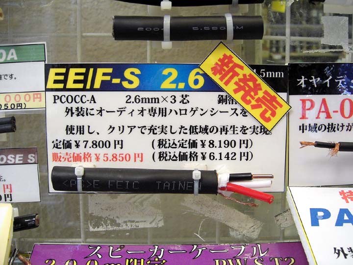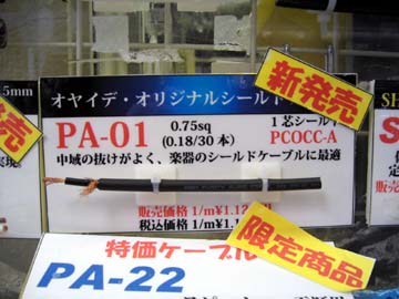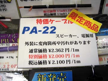 | こちはは電源ケーブルPA-22の特価販売案内。店頭にどっさり置かれていた。撮影時から半月以上経過しているので、まだあるかどうかは知らん。札に記載の通り、外装に偏肉箇所や汚れがある。なお、札には「変肉」と書いてあるが、これは「偏った肉」つまり「偏肉」と書くのが正しいと思われる。