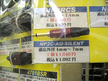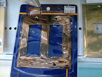 | 左はJIS規格コンセント用の2連型コンセントプレート。極厚真鍮に奇麗なメッキが施されている。かなり重くて、制振効果がありそうだし、見栄えも良い。値段は1,627円。この他、真鍮製JIS2連、3連プレートなどもある。右はUL規格コンセントプレート。東急ハンズ渋谷店にコンセントプレートは数あれど、UL規格対応品はこれのみ。値段不明。スチール製と思われる。特に高品質なものではない。 | ||||||||||||||||||||||||||||||||||||||||||||||||||||||||||||||||