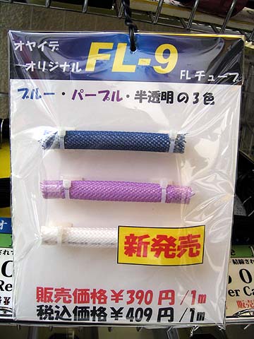 こちら、オヤイデ電気で売られいてるFLチューブFL-9。ブルー、パープルは従来から同店で扱っていたが、この度、半透明のチューブの取扱がはじまった。半透明は製品としては昔から存在していたのだが、この度オヤイデででも扱い始めたと言う事だ。FLチューブは、デンカエレクトロンの製造するプリエステルメッシュチューブの商品名。したがって、このオヤイデオリジナルFLチューブも製造元はデンカエレクトロンだ。デンカの本社は秋葉原から徒歩20分くらいのところにある。 |
