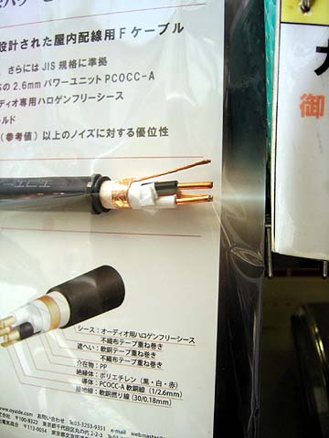偏肉は、外装シースが、ケーブルの中心軸に対して均等に被覆されている状態ではなく、外装シースが偏っている状態を示す。使用上、音質上、特に差し支えは無い。偏肉は製造上の失敗だ。 右上は、オヤイデ電気の秋の新製品。楽器用の信号ケーブルで、型番はPA-01という。ご覧の通り、1芯シールドの構造を有しており、ケーブルの中心軸に位置する導体がホット(+)であり、ケーブル中心軸に対してリング状に配置されている導体が、コールド(ー)である。このケーブル構造の場合、コールドがシールドの機能を兼ねている。 |