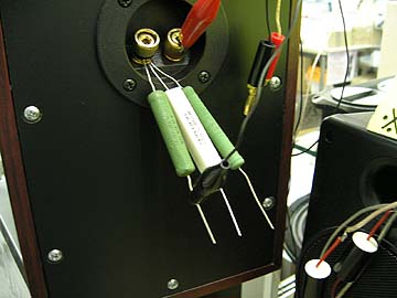 | で、前記のスピーカーを使って、抵抗の音質比較実験をやらせてもらいました。抵抗による音の差ってどうなんですかね?って小泉常務に質問すると、じゃあ今やってみましょうかと言う事で、商品棚に並んでいる抵抗をスピーカー背面のターミナルに挿し込んで、試聴させてくれたのだ。試聴したのは、一般的なスピーカー用セメント抵抗10W(白いやつ、126円)、ムンドルフのセラミック抵抗10W(右の緑色のやつ、価格忘れた)、トリテックのシリコンセラミック抵抗10W(左の緑色のやつ、892円)の3種類。これらをターミナルの+側にまとめて挿し込んで、スピーカーケーブル端末のクリップを順次咬ませていくのだ。これなら一瞬で、音質の比較試聴が出来る。
