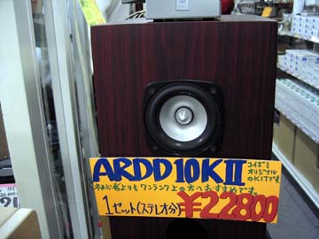 右はコイズミ無線オリジナルのタンデムスピーカーARDD10K Mk2。ユニットはTB製の8cmフルレンジ。外からは見えないが、13cmユニットがボックス内部に1個備えられていて、外部に取り付けられたユニットの背圧を相殺する仕組みだ。それにより、小型ながら優れた再生ができるというもの。このARDD10K Mk2には前身があり、昔はフォステクスのフルレンジユニットをタンデム搭載したものだったと記憶している。間違ってたらごめんね。 |