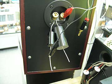 これがまぁ、驚くほどに音が違うのだ。セメント抵抗はがさついて、シャリシャリした音。安いけど、これはやはり価格相応。ムンドルフは前述のセメント抵抗よりかなりレベルが上がって、音像がしっかりした。ただ、歪み感があるように感じた。私の耳にはそう聴こえた。トリテックはピシッとくっきりした音。かつ、繊細で、情報量もしっかりと出て来る。3種の中では、トリテックがダントツだった。 もし、貴方がお使いの市販スピーカーのネットワーク回路にセメント抵抗が使われていたら、それをトリテックの抵抗に交換してやると、音質向上したりしそうだな。市販スピーカーをばらして、ネットワークを改造するのは、それ相応の技量と知識が必要なので、お勧めはしないが、こんなに抵抗で音が違うなら、そういう改造も有効だなと思った。 この実験では、抵抗をスピーカー配線に直列に咬ませた。抵抗を何に使うの?という人のために、簡単に説明しよう。(あくまでスピーカーネットワークにおける抵抗の話だが。)抵抗が入るとどうなるかというと、音量が下がるのだ。2ウェイ構成以上のスピーカーの場合、ツイーターの方がウーハーより音量レベル(デシベル 単位:dB)が高いことが多く、そのままスピーカーとして仕立てたら、高域が強調されたバランスの悪い音になる。そこで、再生音のバランスを整えるために、ツイーターの音圧レベルをウーハーの音圧レベルまで落としてやる必要があるのだ。その音圧を下げる部品が抵抗である。フルレンジユニットを用いたスピーカーには抵抗を付ける必要はないが、一般的な2ウェイ以上のスピーカーには、通常、ツイーターのレベル調整のために抵抗が使われている。 抵抗には、固定抵抗と可変抵抗の2種類がある。固定抵抗は前述したような抵抗そのものであり、可変抵抗とは、俗に「アッテネーター」と言われるもので、抵抗の利き方のレベルがツマミで調整できるタイプのものだ。JBLの4343/4344/4348などのフロントパネルに付いていたりするツマミがそれである。 一般的に、音は固定抵抗の方が良いと言われている。ただし、使い勝手は可変抵抗の方が上だ。固定抵抗の場合、単純にある一定量に音量を下げるだけで、音量を微調整することができない。やるには、固定抵抗を外して、別の値の固定抵抗に組み替えてやる必要がある。可変抵抗の場合、音量を自由に絞り込む事が出来る。 抵抗の話でずいぶんと長くなってしまった。抵抗の比較ついでに、コンデンサの試聴もさせてもらった。小泉常務お勧めの、安くて個性的な音のコンデンサ、ムンドルフのMKTである。右上がその実験風景で、抵抗のときと同様にスピーカーターミナルにコンデンサを咬ましての試聴である。 比較したのは、ソーレン(SOLEN)のコンデンサ。昔から流通している良質でオーソドックスなコンデンサだ。たしか、B&Wも昔はソーレンのコンデンサを使っていたと記憶している。今はムンドルフを使っているはずだが。 |