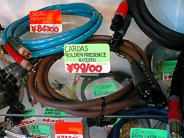| テレオンサウンド110の3階。カルダスのGOLDEN REFERENCEの色が変わったのかと思いきや、よく見ると新製品のGOLDEN PRESENCEだった。音はゴールデンリファレンスとは異なり、下位のCROSS(奥の緑色のケーブル)に近いマイルド基調らしい。
