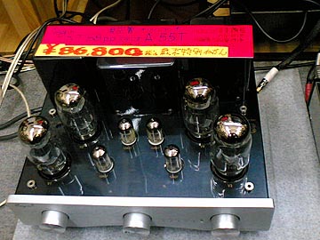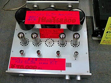 | コイズミ無線本店。コイズミオリジナル(たぶん)の真空管アンプ。型番はKAX-EL34。1台のみ処分特価68,800円。右はカインラボのA-55T。定価126,000円で、実売特価96,000円だったが、最近さらに歳末特価として86,800円に値下げ。KT88が4本。 | ||||||||||||||||||||||||||||||||||||||||||||||||||||||||||||||||
