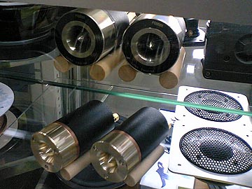 右上はムンドルフの空芯コイル。ややオレンジがかった絶縁材が使われている。なお、同店では今後ムンドルフの取扱を止めるそうだ。DYNAUDIOJAPANがムンドルフの正規輸入商社になり、また、その関係先としてムンドルフ専門扱い業者ディーフォースが去年設立されている。そのことが影響しているのか。ま、六本木は取扱品目が多いので、ムンドルフの取扱を止めても、売り上げにあまり影響無いんじゃないかな。 |