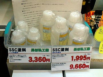 | 長谷弘工業の特殊塗料SSC。右はスピーカーボックスに塗布するタイプ。木質を硬化して音質向上を図る。左はユニットのコーン紙に塗布するタイプ。コーン紙を硬くして、音質向上を図る。アルコール系の塗料で、色は透明、極微細なガラス質の成分が含まれている。昨年登場した塗料なので、目新しくはないが、ユニット用SSCは私の次期スピーカーのユニットに塗布してみたいと思っている。しかしこの塗料、高いっす。