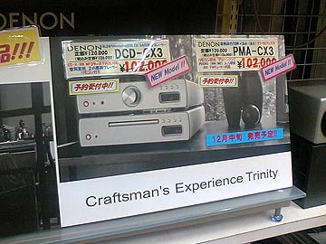 | テレオン第一店。DENONの新型アンプPMA-CX3/新型SACDプレーヤーDCD-CX3の案内ポスター。同店に限った事ではないが、同機の購入予約を募る店が多い。それなりに注目度が高い製品なのだろう。発売後、しばらくは品薄状態が続くと思われるので、確実且つ早めに欲しい人は予約すべし。オーディオ店によっては、予約購入者に御影石やキンバーのRCAケーブルをプレゼントするというところもある。