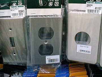 所代わって、右は東急ハンズ渋谷店。電気照明部品フロアで売られいてる各種コンセントプレート。オーディオ用として売っているわけではないが、JIS規格コンセント用プレート(長方形の穴が開いたもの)はオーディオ用にも応用出来る。 |
