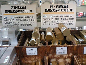 | 東急ハンズ渋谷店の素材フロアの金属素材コーナー。アルミと銅、真鍮の価格改定のお知らせを記した札が張られていた。材料価格の高騰によって販売価格を大幅に値上げしましたという告知だ。パッと見た限りでは5割ほど値上げされているようだった。最近、金属価格の高騰がすさまじい。これは世界的な規模で起こっているのだが、特に銅の値段が急騰している。困ったものだ。ニュースで話題になっている道路の側溝やマンホールの窃盗事件も、金属価格の高騰が誘因となっている。 | ||||||||||||||||||||||||||||||||||||||||||||||||||||||||||||||||