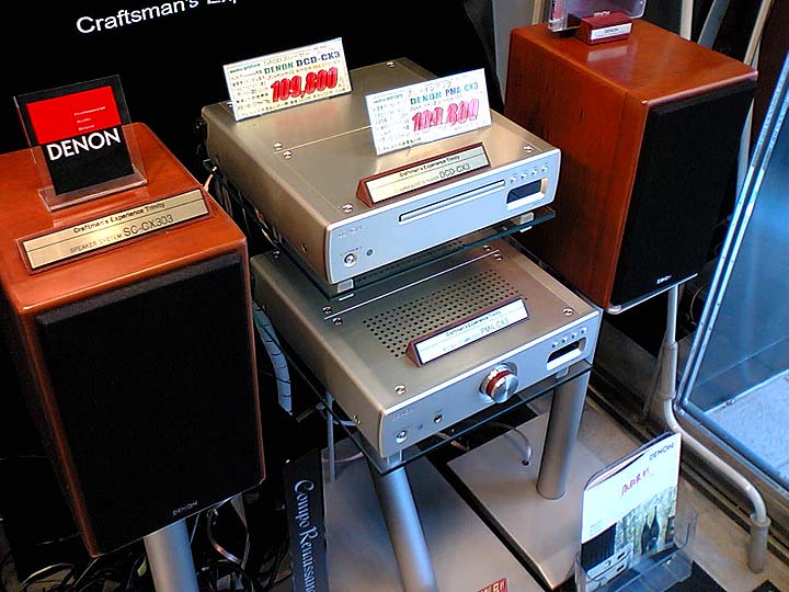 | オーディオユニオンお茶の水店。1階の出入り口すぐにデノンのCXシリーズが陳列されていた。CXシリーズは、本格的な造りでありながらコンパクトなオーディオ機器のシリーズで、新型SACDプレーヤーDCD-CX3、チューナー内蔵プリメインアンプPMA-CX3、2wayブックシェルフスピーカーSC-CX303がラインナップされている。価格はそれぞれ定価126,000円に統一されている。DCD-CX3、PMA-CX3は昨年12月中旬に発売されたばかり。同シリーズについては、先月の巡礼記で熱々と語らせてもらったが、とにかく魅力的なコンポーネントである。SC-CX303は大きさの制限から、価格相応の音であるが、DCD-CX3、PMA-CX3の出来は素晴らしい。「これでもういいんじゃない」と思わせる造りと音を有している。同シリーズに関しては、デノンもかなり販売に力を入れているらしく、オーディオ店各店で試聴会などをおこなっている。近場のオーディオ店で試聴会が開かれたらぜひ行ってみるべし。オーディオマニアにとっての、セカンドシステム、いやメインシステムとしても十分に通用する内容である。 | ||||||||||||||||||||||||||||||||||||||||||||||||||||||||||||||||