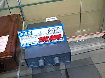 同店2階に陳列されているJOBのプリアンプJOBPRE。定価241,500円が中古158,000円。ゴールドムントの弟ブランドで、価格も手頃で、大きさもコンパクトで、妙な存在感を持ち合わせていると言う事で、それなりのタマ数が国内流通していると思われる。中古店でもたまに見かけることができる。入力はRCA4系統、出力はRCA1系統。なお、写真には映っていないが、同じショーウインドウ内には、JOBのモノラルパワーアンプTHEJOB150のペアが、定価378,000円の中古248,000円で陳列されていた。THEJOB150は超ハイスピードパワーアンプとして、名高いアンプ。同寸法同デザインのJOBPREと組み合わせて使うのが、好適と思われる。ま、私は使った事無いので、どれほどのハイスピードなのかはわからんが。 |