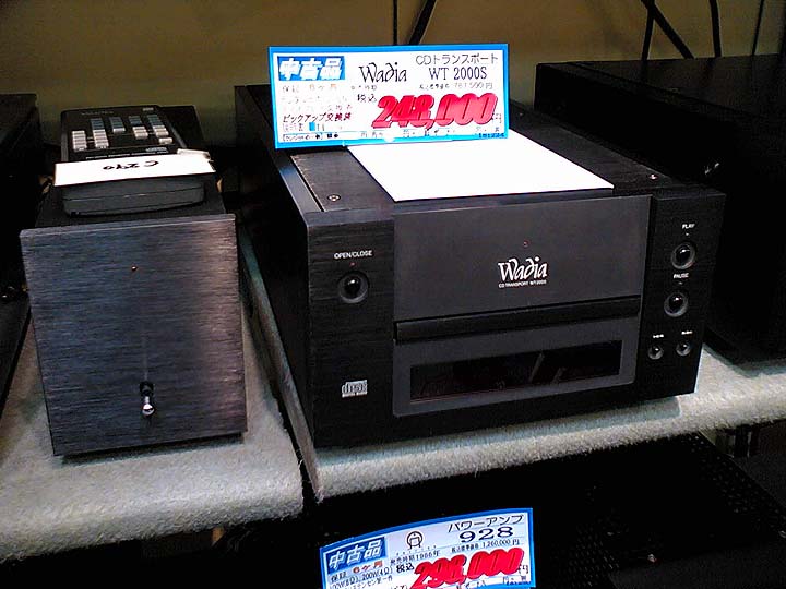 | 同店2階にはいつも名機、珍機が盛りだくさんに並んでいる。こちらは、WadiaのCDトランスポートWT2000S。定価7,875,000円のところ中古248,000円。ピックアップ交換済みのお買い得品。WT-200Sの発売はたしか1991年頃だったか。15年以上も昔のトランスポートだが、ブランド力と音の良さが相まって、いまだに人気が高い。中古過248,000円は妥当な価格。WT-2000Sはご覧の通り、同機は電源別筐体となっている。同機のメカニズムはTEACのP2sと同じVRDSメカを採用している。同機に限らず、Wadiaのプレーヤーの大部分はVRDSメカを採用している。 | ||||||||||||||||||||||||||||||||||||||||||||||||||||||||||||||||