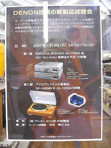 | 昌平橋からすぐのところにテレオンサウンド110がある。同店店頭入り口には、デノンCXシリーズの試聴会が告知されていた。試聴会は1月14日日曜日14時から。会場は同店5階。講師は石田善之先生。興味のある人は行ってみるべし!