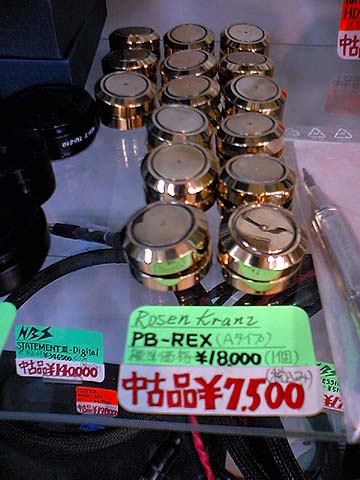| 同店3階のアクセサリーフロア。ローゼンクランツのインシュレーターPB-REXの中古が15個入荷。人気のあるブランドのインシュレーターなだけに、すぐに売れてしまうのではないか。なお、同展示品は、PB-REXの初期型。同ブランドのインシュレータは3点支持で使われる事が多い。3個買うと2万弱か。