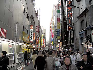 | 秋葉原の大動脈、中央通り。家電店やPCショップやソフト関連店が立ち並んでいる。この日(1月8日)は休日なので、中央通りは歩行者天国。この写真は末広町方面から秋葉原方面を撮影したもの。中央通りの奥に見える緑色の橋は、総武線の高架橋。左手に見えるドンキホーテの中には、AKB48というアイドルのイベント会場が常設されており、このドンキの麓付近に、複数の人集りができていた。私は普段、中央通りのホコ天を歩く事は無いので、いったい何に人の群れができているのか、興味のあるところだ。大方の予想はつくけど。 | ||||||||||||||||||||||||||||||||||||||||||||||||||||||||||||||||