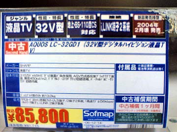 | こちらもカクタソフマップ。中古シャープの液晶テレビアクオスLC-32GD1が中古85,800円。激安だと思うのだが、発売から3年も経ったら、液晶テレビもこんなもんか。同機は、私が使っているLC-26GD2と同じ時期に発売された液晶テレビで、画像はかなり奇麗だ。パネルは亀山工場で最終組み立てされた、俗に言う「亀山モデル」ってやつだ。下部に付いているスピーカーは脱着可能で、オプション金具を使えば壁掛けも可能。DVIポートも付いていたはずで、PCのモニターとしても使え、地上波デジタルチューナーも付いているなど、豊富な機能が盛りだくさん。現行の薄型テレビとの相違点は、あえていうならHDMI端子が装備されていないこと。HDMIが普及したのは、ここ1年ほどの出来事だかなら。ま、この機種がこの値段なんて、とってもお買い得だと思うんだが。 | ||||||||||||||||||||||||||||||||||||||||||||||||||||||||||||||||