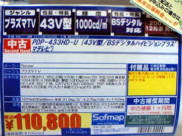 | こちらはパイオニアのプラズマテレビPDP-433HD-U。2001年製。パイオニアが大型薄型テレビを席巻していたときの機種だ。いまや、地上波デジタルチューナーが内蔵されていない薄型テレビは、たとえ43インチだろうが50インチだろうが、価値はグンと下がっている。この機種も、現行当時はたしか70〜80万くらいはしていたと思う。中古11万とは、なんか可愛そうな値段だ。同店舗には、同機が2台、それに50インチのパイオニア製プラズマテレビが15万程度で2台並んでいた。 | ||||||||||||||||||||||||||||||||||||||||||||||||||||||||||||||||