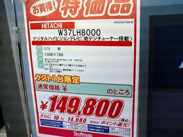 | こちらは日立の現行機種処分品。W37LH8000という型番で、パネルサイズは37インチだ。HDは内蔵していない。新品37インチが149,800円とは、薄型テレビの値段は加速度的に安くなっているなぁ。HDMI端子も当然ながら搭載している。 | ||||||||||||||||||||||||||||||||||||||||||||||||||||||||||||||||
