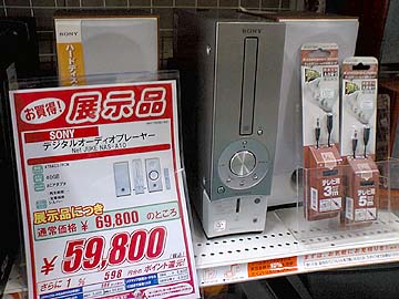 | ソニーのミニコンポNAS-A10。40GBハードディスク内蔵。HDに音楽情報をコピーして、ジュークボックスとして使えるわけだ。最近のミニコンポはハードディスクを内蔵しているのだなぁ。時代の流れをしみじみ感じる。同店1階には中古のデジタルカメラも多数展示販売されている。右はちょっと欲しいなぁと思っているサンヨーのXactiシリーズのDMX-6CA。生活防水タイプのデジカメで、かなかなかかわいいデザインを有している。サンヨーのデジカメはマルチーズというシリーズを発売していた当時から、動画の録画に秀でており、その血統はザクティにも受け継がれている。以前、知人からXactiで撮った動画を見せてもらった事があったが、デジカメで撮ったとは思えないほど奇麗な画像だった。DVカメラの代わりに、これが欲しいなと思っている今日この頃。なお、Xactiでの動画記録方式はMPEG4だ。 | ||||||||||||||||||||||||||||||||||||||||||||||||||||||||||||||||