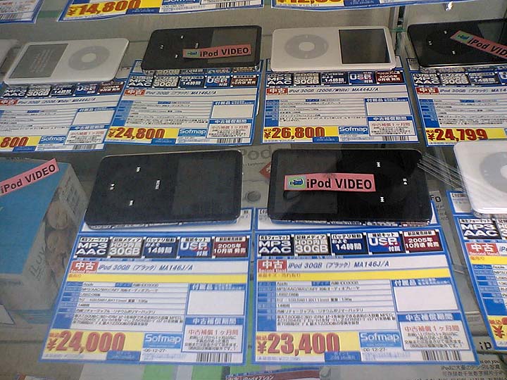 | ソフマップ11号店。現行の前の型のiPod30GB(MA146J/A)が中古23,400円。現行当時はたしか36,000円程度だったか。そろそろ買い時か。私まだこの手のポータブルオーディオプレーヤー持ってないんです。 | ||||||||||||||||||||||||||||||||||||||||||||||||||||||||||||||||