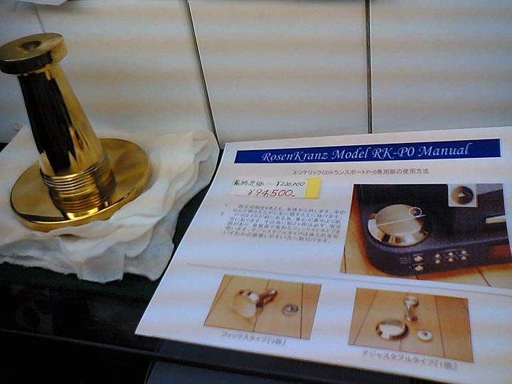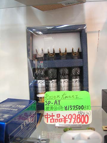 | ところかわって秋葉原テレオンサウンド110(テレオン第2店)の3階。ローゼンクランツのスピーカーアタッチメントSP-ATが中古で登場。(4月下旬時点ですでに販売済み)これはYラグとスピーカーターミナルと、その間に謎の配線材を組み合わせた音質向上アクセサリー。スピーカーターミナルにSP-ATを装着し、SP-ATのターミナルにスピーカーケーブルを装着することで、「1.再生音がX,Y,Zの3軸の完璧な音楽バランス。2.部屋の壁を取り払ったかのような広大な音空間。3.本物の楽器の持つ品格や質感をありのままに表現。4.貴方のスピーカーが生演奏に勝るような音に変身します。5.何百万円のコンポを変えた以上の効果です。6.システムのグレードが高いほど、その実力を発揮します。」とのこと。右は、同じくローゼンクランツのインシュレーターPB-BIG。3個セットで中古販売。PB-BIGのニューバージョンが今年3月に発売されているので、それにともなう買い換え放出だろうか。なお、同社の製品は中古市場でも値崩れせず、比較的高い金額で取引されている。 | |||||||||||||||||||||||||||||||||||||||||||||||||||||||||||||||