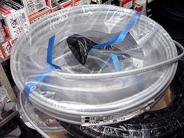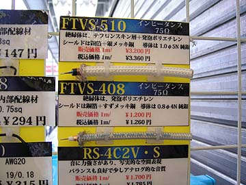 | デジタル切り売り同軸ケーブルのFTVS-408(定価1575円/m、実売1260円/m)およびFTVS-510(定価4600円/m、実売3360円/m)。プラス側導体に4N純銀線を用いた贅沢な切り売り同軸ケーブルだ。FTVS-408は、アンテナ線の4C線に該当する。FTVS-510は、アンテナ線の5C線に該当する。いまから2年ほど前に発売されて以降、そのコストパフォーマンスの良さから人気を博している。特に、FTVS-510はデジタル同軸ケーブルとしてはもちろんのこと、またラインケーブルとして用いても、圧倒的な解像度とS/Nを有するとして使用者が増えていた。私もFTVS-510を用いたデジタルケーブルを使っているし、私のところにもFTVS-510をデジタルケーブルに使って非常によい結果を得られたとのメールが幾通か寄せられている。このように、マニア間で話題になっていたFTVS-510だが、季刊オーディオアクセサリー124号の福田屋コラムにて、福田先生がアコースティックリバイブのDSIXキット(18900円)との組み合わせ自作例DISX-510を掲載され、その音を「別次元の音」「10万円以上の価値がある」「FTVS-510のクオリティは抜群」と絶賛さてから、人気はうなぎ上り。オーディオ銘記賞2006も受賞している。切り売り同軸ケーブルが同賞を受賞するというのはひょっとして初めてかも。