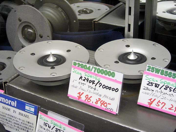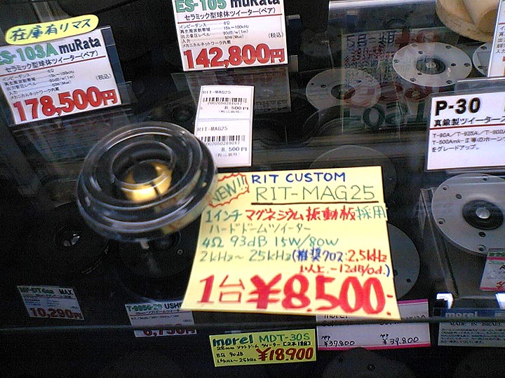 | アキバに戻って、こちらはコイズミ無線。六本木工学研究所のオリジナルブランドであるリットカスタムのツイーターが登場。型番はRIT-MAG25。マグネシウム振動板を用いているそうな。 しかしまぁ、スピーカーユニットは、この5年ほどで製品数、ブランド数が激増した。(テクニクスのユニットのように消えたブランドもあるが。) 製品数激増の一因となっているのは、タンバンやアッシャーなどの台湾メーカーの台頭と、それらのユニットを積極的に扱ってきた六本木工学研究所の存在が大きいと思う。このように、ユニット数が増えるのは、スピーカー自作ファンにとっては嬉しい限り。次から次へと発売されるユニットたちが、はたしてどのくらいの数売れているのか、ちょっと気になる。ま、私が気にしても、しゃーないのだが。 数えようもないのだが、自作スピーカーの制作人口自体は、ここ数年、さほど増えていないように感じる。むろん、フォステクスはAVフェスタなどでイベントを催したり、学研と組んでスピーカーユニットの制作キットを発売して、自作スピーカーファンの拡大に努力している。ステレオ誌やオーディオベーシック誌もがんばっている。それに、ネットの普及で、様々な情報が容易に得られるようになっている。けど、何か、いまいち盛り上がりに欠けるような気がするのだ。そして、その原因は、やはりあの方が逝ってしまわれたことにあるのだろうと。そう感じているのは私だけだろうか。 |