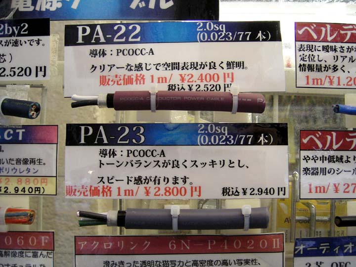 ピンキングの対策として、同社では変色に関係する成分を使わないシースに変更し、合わせてシースの色も変更した。このPA-22に用いたあずき色はとても奇麗な色で好感が持てる。かねがね、このような渋みのある色のケーブルを造ってくださいと言っていたのだが、それが思わぬことから現実になった。たぶん、私の要望とか無関係にあずき色が採用されたのだとは思うが。なお、私は初期バージョンのPA-22/PA-23を所有しているが、1年以上経った今でも変色していない。また同じ白シースでも、TUNAMI2号ではピンキングは起こらないそうだ。 |