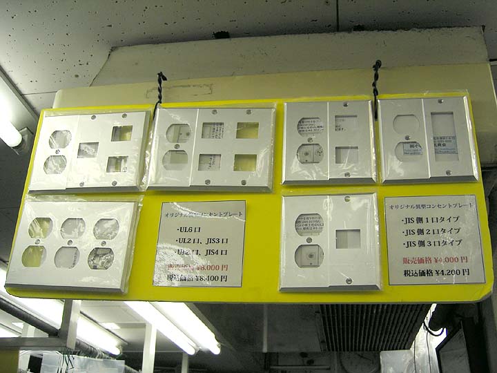 | オヤイデ電気店内に新たに設置されたコンセントプレートのディスプレイ。このコンセントプレートは7mm厚(ULコンセントはめ込み部分は5.5mm厚)のアルミ板をNC切削し、さらにアルマイト処理して制作されている。