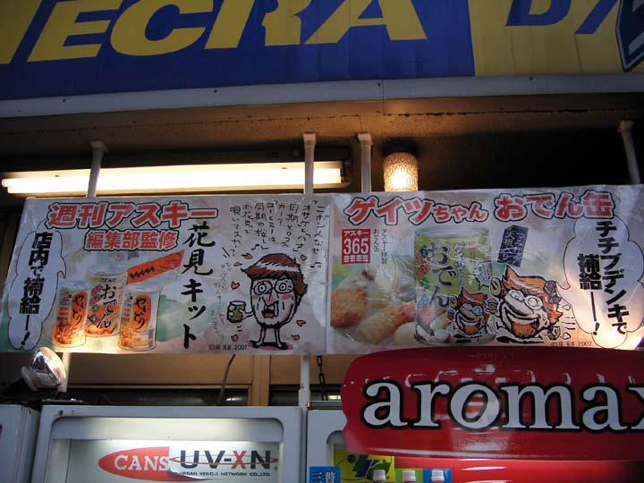| こちら元祖おでん缶の自販機の上。ご覧のような立て看板が登場。このキャラクターは、週間アスキーお馴染みのゲイツちゃんだ。 | |||||||||||||||||||||||||||||||||||||||||||||||||||||||||||||||