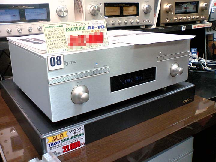 | エソテリックのプリメインアンプAI-10が新入荷。同社久々のプリメインアンプである。しかも今回はデジタルプリメインだ。定価367500円。W442mm×H149mm×D383mm。ワードシンク出力も有している。アナログ入力に加え、RCA/TOS/iLinkといったデジタル入力を備えている。従来の同社のデザインの流れに無い、目新しいデザインだ。これは今春の注目株ですな。 | |||||||||||||||||||||||||||||||||||||||||||||||||||||||||||||||