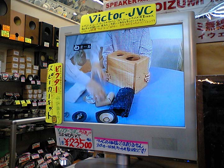 | コイズミ無線ミツウロコビル1階店。店頭でビクターのウッドコーンスピーカー自作キットSX-WD5KTに付属のビデオが流されていた。SX-WD5KTはこのようにビデオ解説が付属しているので、スピーカー工作未体験者であってもチャレンジできそうだ。ハンダ付けはしなくてはならないが。 | |||||||||||||||||||||||||||||||||||||||||||||||||||||||||||||||