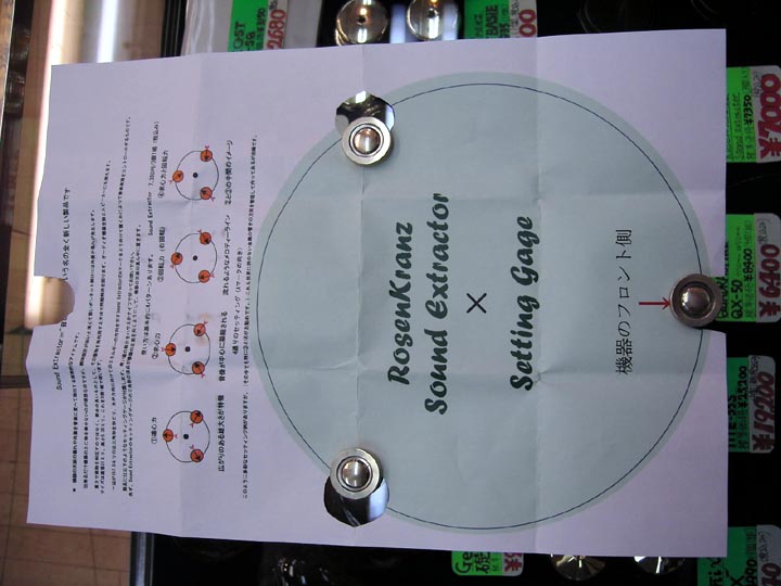 | こちらテレオンサウンド110。ローゼンクランツのサウンドエクストラクター(音の抽出機の意味)。これはオーディオ機器の天板に載せることで、音質向上を図るアクセサリーだ。機器の脚に使うインシュレーターではない。「機器の不要振動を押さえ込むのではなく音楽信号として抽出します。」とのこと。素材は真鍮。ローゼンクランツの製品にしては3つで7,000円と安い。上記写真は、同製品に付属のセッティングシートを広げてみたところ。同社らしく、製品の置く方向性によって、音質をコントロールできるらしい。 | |||||||||||||||||||||||||||||||||||||||||||||||||||||||||||||||