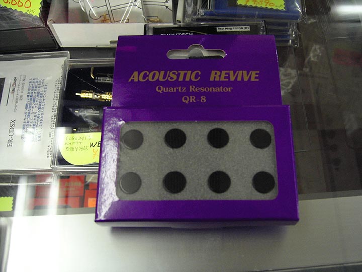 | で、同店2階で撮影したアコースティックリバイブのクオーツレゾネーターQR-8。貼りもの系アクセサリーだ。発売から3ヶ月ほど経過しており、すでにオーディオ各誌で試聴記事等が掲載されているから、知っている人も多いだろう。もう使っている人もいるんじゃないかな。 QR-8は、厚み3mm、直径10mmの黒水晶のチップで、その作用機序は「あらゆるプラグやコネクター、パーツ、機材スイッチ、機材筐体、部屋のドア、窓、壁、床、天井などは、それぞれ固有の共振周波数にて共振を起こしているため、QR-8を貼る事により周波数が変わり、共振を止める事が出来る」とのこと。QR-8は、同社の黒水晶員シュレーターRIQ-5010をそのままダウンサイジングして、チップ化したもの。RIQ-5010は、以前、同社の試聴会で非常によい効果を確認し、その後、私も購入して使用している。RIQ-5010を使うとなんというか、ボーカルの生々しさが向上する。なので、同じ黒水晶で造られたGR-8にも期待が高まる。私はまだ買ってないっすけどね。 QR-8は、8個で定価8800円。QR−8のセット図は、同社サイトのこちらに掲載されている。このセット図を見る限り、使い方はレクストのレゾナンスチップと同様だ。 |