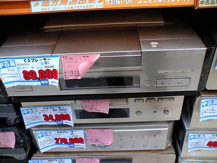 | 同店に入荷したケンウッドのCDプレーヤーL-D1。たしか1992年頃発売の製品だったか。トップローディング機。作り込みがしっかりしているようで、いまだにけっこう人気のある機種です。サイドウッドが年代を感じさせますが。 ケンウッドもこの中級プレーヤーをポンと発売したっきり、この価格帯のピュアオーディオ機器出さなくなっちゃっちゃいました。残念。MDデッキはその後もがんばって出してたんだけど。興味のある人は、まだ残ってるかどうか、オーディオユニオンの中古速報で確認するのがよかろう。 |
