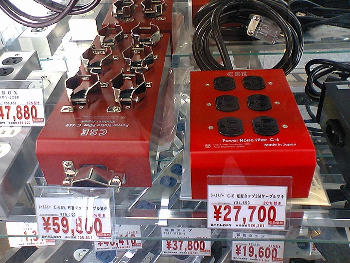 | ヨドバシカメラ秋葉原店。CSEの新型電源ボックスC-66RとC-6が入荷。赤色が斬新だ。すでに同製品に関しては、オーディオ各誌に情報が掲載されているので、ご存知の方も多いだろう。C-66Rの発売に伴い、ZX-80Aは絶版になった模様。ZX-80Aは本当に息の長い製品だった。 C-66Rは、プラグを強固に保持出来る保持手段を備えているのが特徴。プラグのぐらつき解消は、非常に重要な課題であると考えているが、それをこのような保持手段を用いて解決したCSEはえらい!なお、この保持手段は、すでに同社製品のいくつかに採用されているので、C-66Rが初めてというわけではない。 |