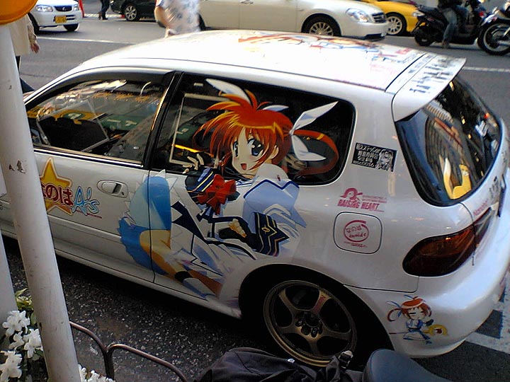 最近、休日の秋葉原ではこのような車が数台並んで停まっている。道行く人の注目を集めていた。オタクの新たな表現方法だと思った。ここまで大胆かつ徹底して、自分の好きなものをアピールできるというのは、ある意味すばらしい。勝手に萌車と呼ばせてもらおう。 追記:このようなアニメのキャラをプリントした車を「イタ車」というらしい。見た目にイタい車という意味だ。 |