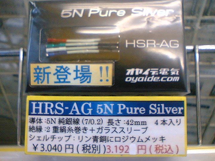 オヤイデ電気のアナログ進出第2弾、カートリッジHS-CFに続いて、HRS−AGが登場。5Nの銀線を用いたリード線だ。絹糸絶縁に、最外装は白いガラススリーブを被覆。絶縁性と強度にも十分配慮されている。絶縁に絹糸を採用したところに、オヤイデ電気の先見性を感じる。単に商品アイテムを増やすためであれば、もっと安易な素材を組み合わせて製品化出来るであろうに、例えリード線のような構成部材の少ないアイテムでも手抜きをしないオヤイデ電気であった。ま、うんちくたれながら、私まだこれを試してないんですけどね。