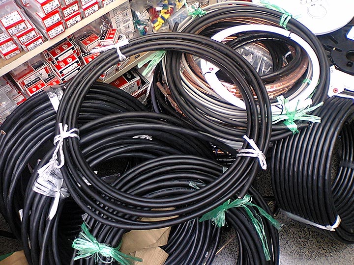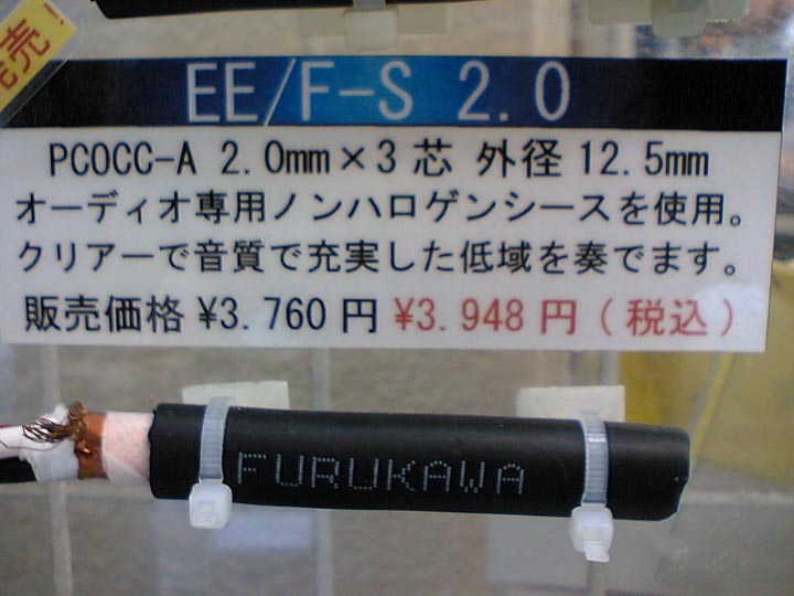 店内足下にはEE/F-S2.0やEE/F-S2.6や藤倉CV-S3.5などがごろごろと転がっている。あ、この写真は9月末のもので、11月になってからは店内がずいぶん整理整頓されてました。 世の中には恵まれたオーディオマニアがたくさんいるらしく、家屋の新築にともなうオーディオ専用ルームへの屋内配線用に、EE/F-S2.6は相当数売れているらしい。一度に60m買っていったマニアもいるそうな。まぁ、60mとなると手持ちでは持って帰れないな。ま、電源ケーブル用に買っていく人もかなりいると思うけど。