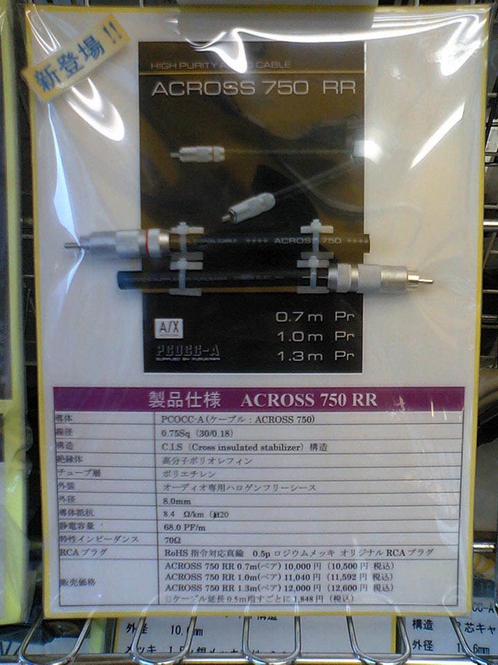 PCOCC-Aを使った完成品ラインケーブルACROSS750 RRも発売された。すでにオーディオ各誌に紹介されているので、ご存知の方々も多いだろう。この構造と素材で、1m実売1万弱とは安すぎる。なお、このラインケーブルに使われているケーブルはACROSS750として切り売り販売されている。プラグに関して、オヤイデ電気はコレットチャックを採用しない。その理由を尋ねたところ、コレットチャックはケースが時間経過とともに緩み、これが振動源になる恐れがあるから、音質面を考慮して、コレットチャックは採用しないらしい。 |