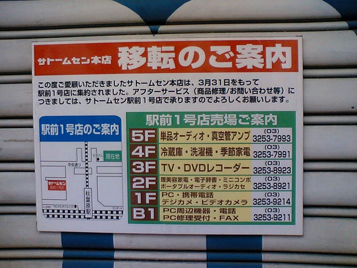閉店のお知らせのアップ。このお知らせでは、本店は駅前一号店に集約されたとある。しかしながら、サトームセン駅前1号店も11月11日をもって閉店した。これで秋葉原に残っていたサトームセンは全て消滅した事になる。このように、秋葉原はいま、老舗店の閉店ラッシュなのだ。 |