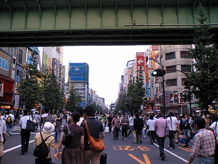 9月中旬の秋葉原の中心街、中央通りの風景。この日は日曜日で、中央通りはホコ天。写真中央の奥に、ソフマップの看板を掲げた改装中のビルが映っているが、これは今夏までヤマギワソフト館だったビル。ヤマギワソフト館が消滅した事で、ヤマギワ電気の名を残す店舗はヤマギワリビナのみとなった。