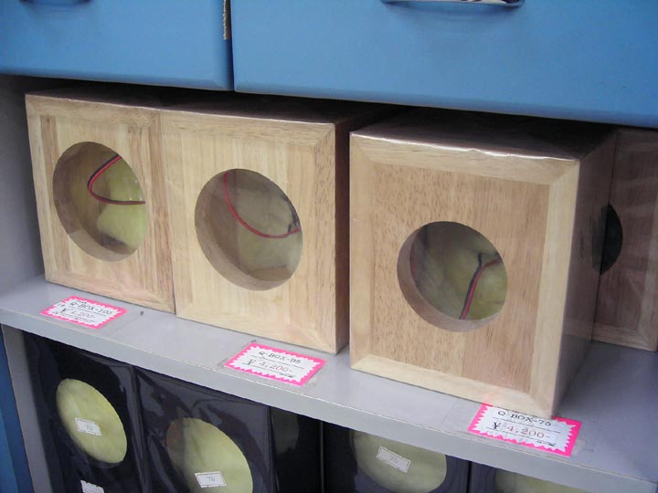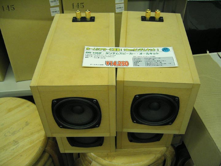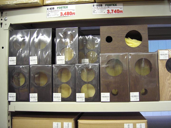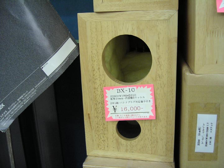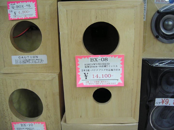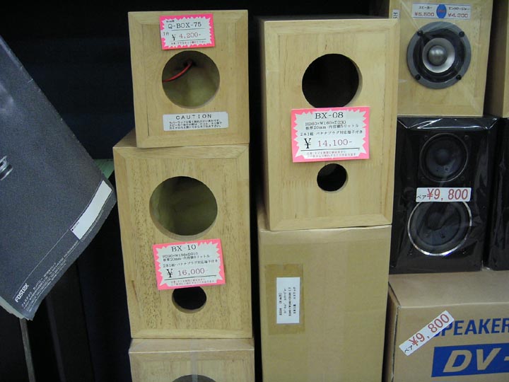 先のラバーウッド製エンクロージュアのアップ。こちらQ-BOX75、Q-BOX95、Q-BOX100。こちらは1台4200円。なお、この先のラバーウッド製エンクロージュアは、いまのところ、木村無線以外ではみかけたことがない。